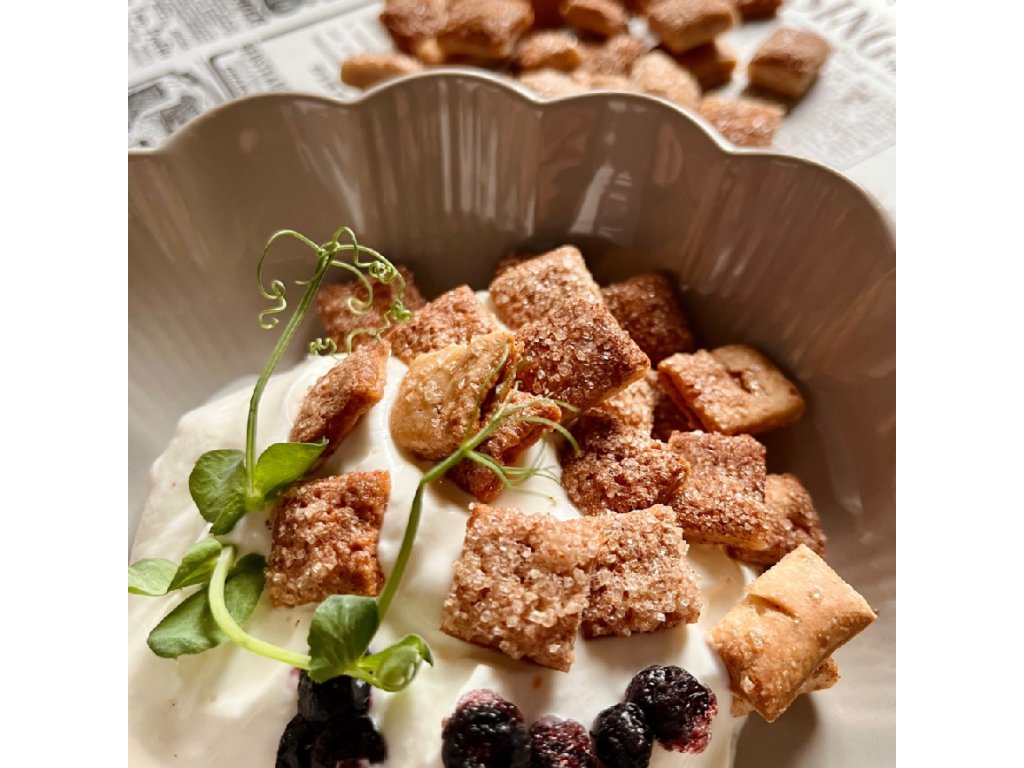 Složení: žitný kvásek (žitná mouka, voda), pšeničná mouka, celozrnná špaldová mouka, máslo, kokosový olej, cukr, skořice, sůl